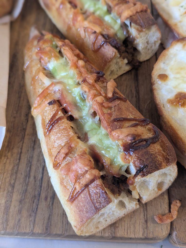 タコスミートとアボカドソース、ウインナー、チーズをたっぷりバゲットに挟みました。 暑い夏に食べたくなる一品です。是非ご賞味下さい。