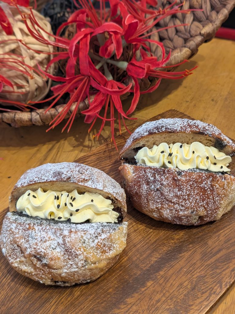 黒ゴマあんとマスカルポーネホイップを挟んだショコラザマンドです。